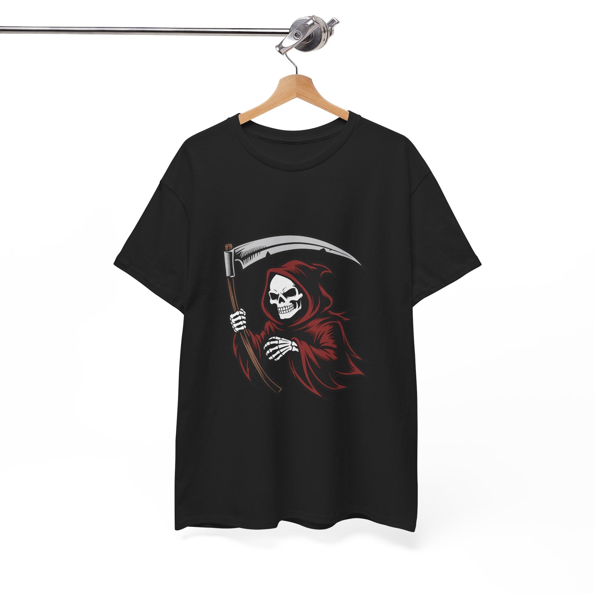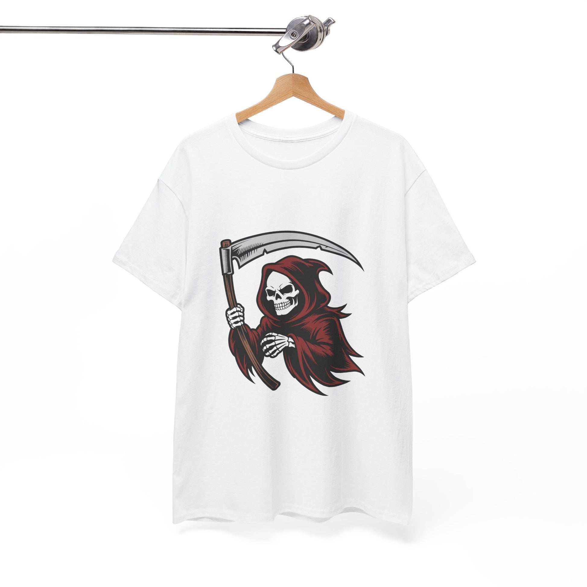 This classic cotton tee wears its attitude loud but simple. A bold, illustrated Grim Reaper in deep reds and ink-black lines sits centered on a crisp white canvas, giving the shirt a brooding, streetwise edge. The medium-weight cotton holds print detail with clarity and a matte finish that feels substantial without weighing you down. Wear it layered under a denim jacket for nights out, with ripped jeans for shows, or alone when you want your look to speak for itself. The relaxed, timeless cut and crew neckline keep the silhouette familiar and easy to move in, while the tear-away label and reinforced shoulders keep comfort front and center during long days or long sets. This piece blends skate-punk grit with graphic-art clarity — for anyone who collects statement tees and nights that don’t go by the book.
